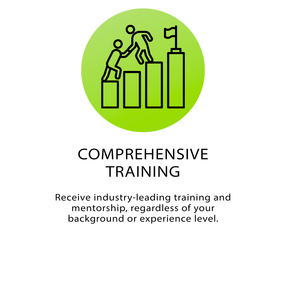 we're committed to your success. Our comprehensive training program and ongoing support systems are designed to help you build a thriving career, regardless of your background or experience level.